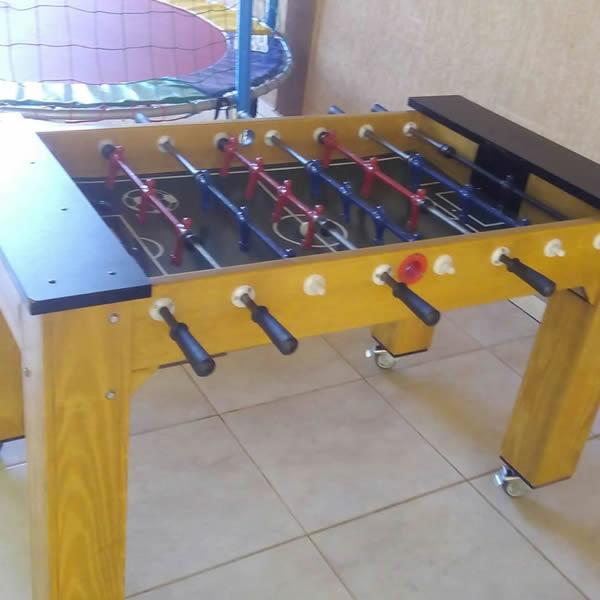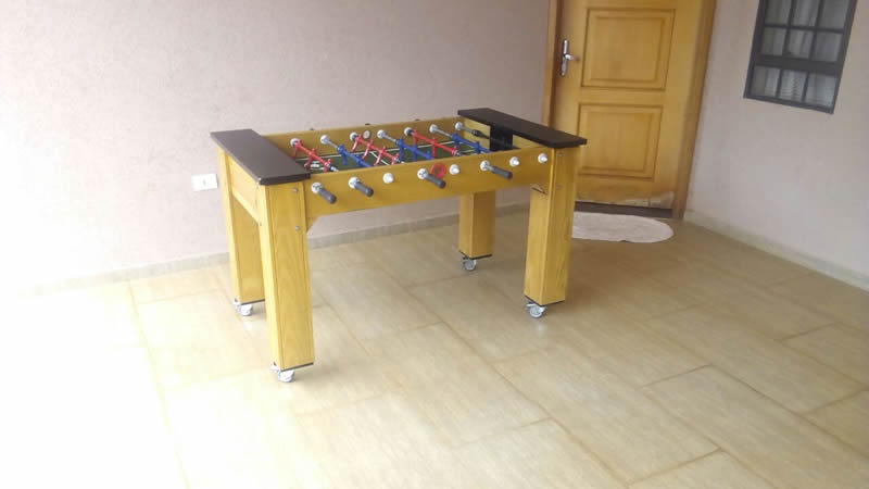 Nosso pebolim profissional de madeira maciça com jogadores de ferro e varetas embutidas oferece um melhor desempenho e segurança aos jogadores. Pode jogar até quatro jogadores.